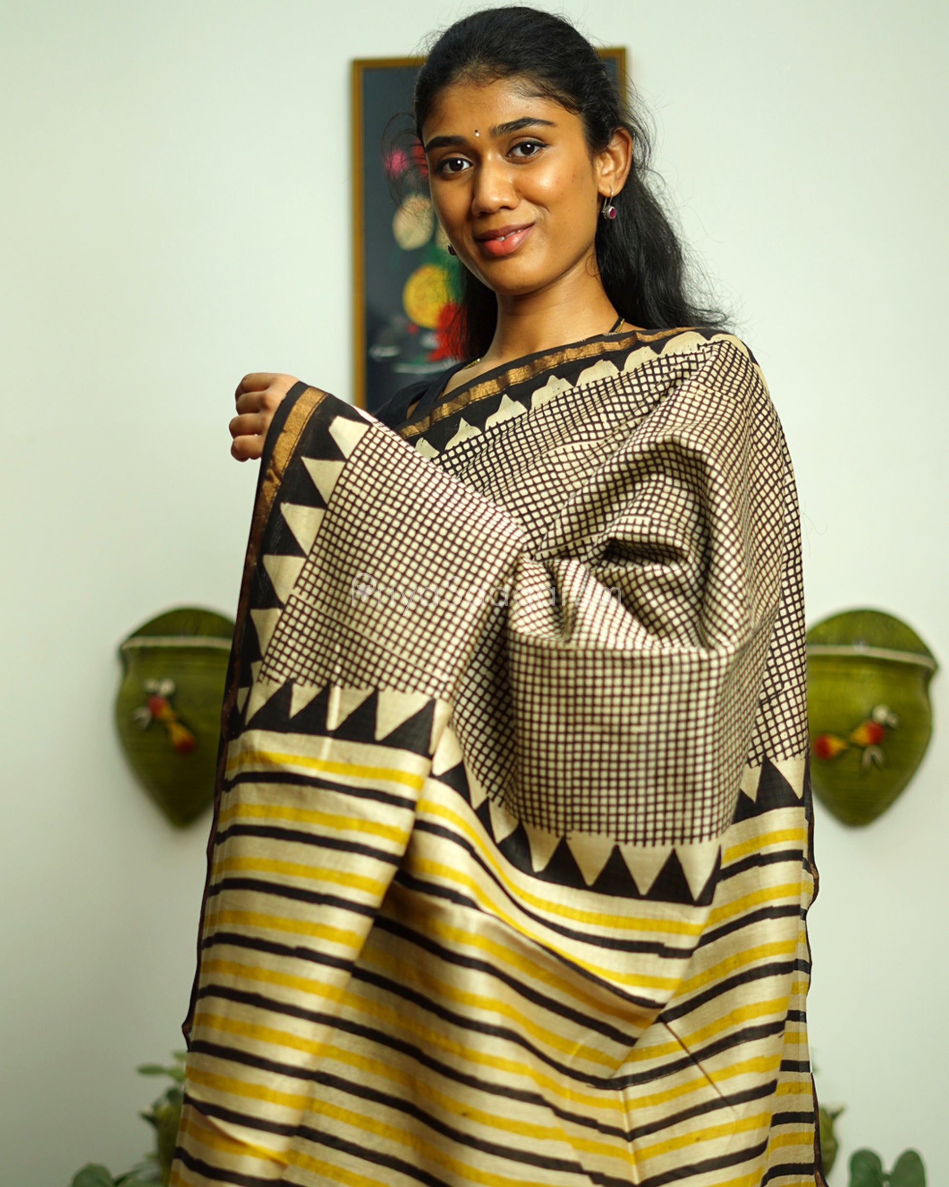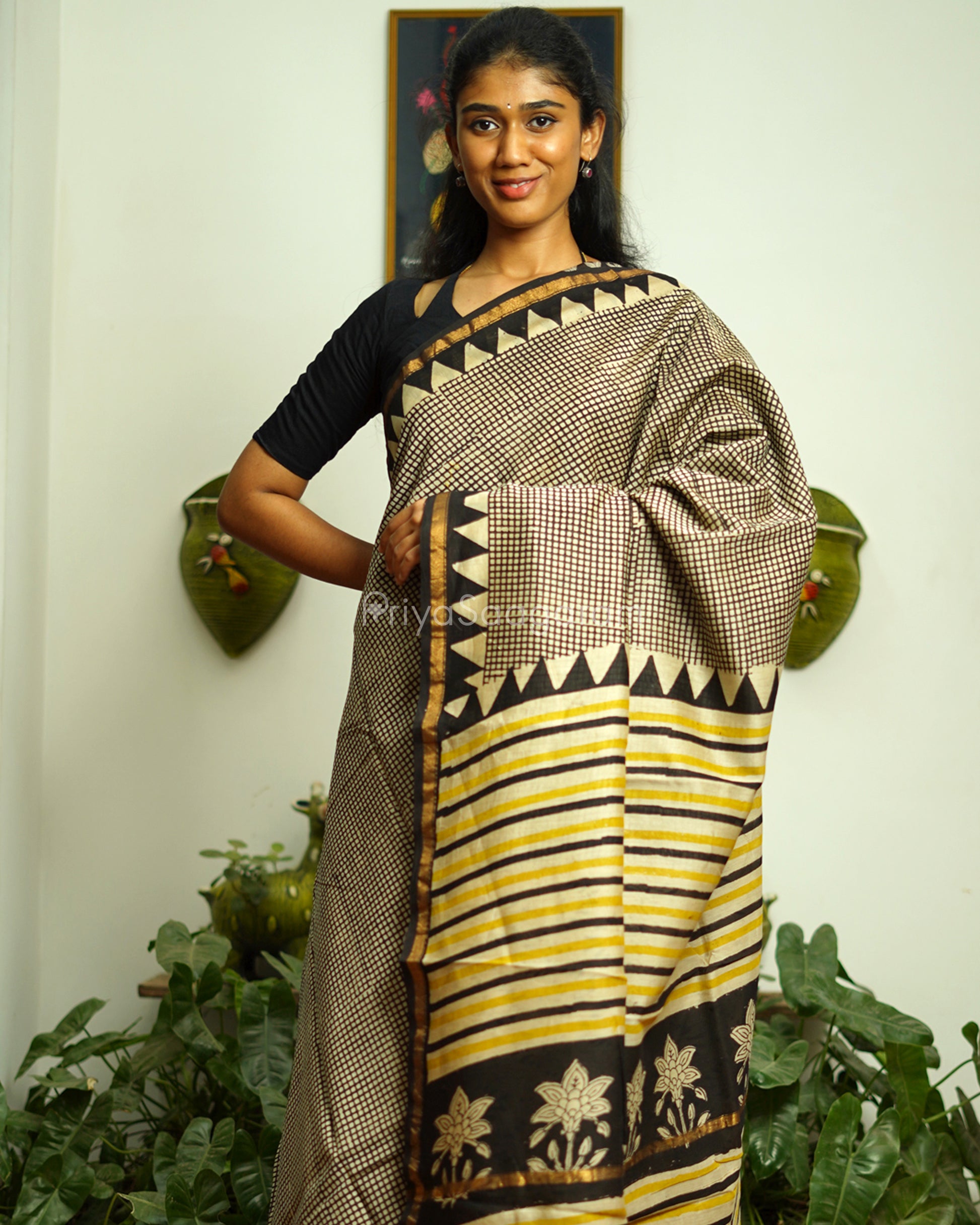 Black Checked Bagru Print Chanderi - PD370